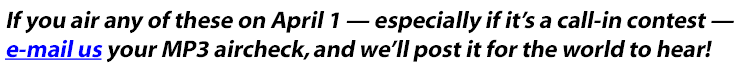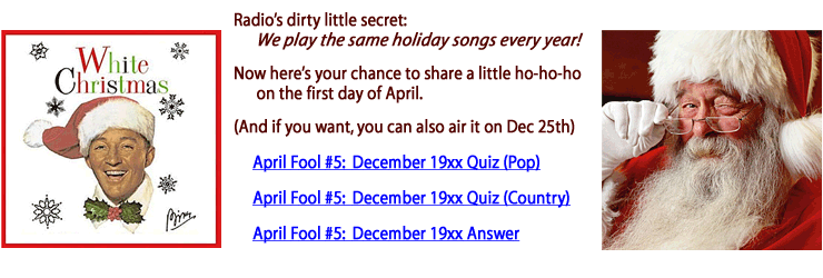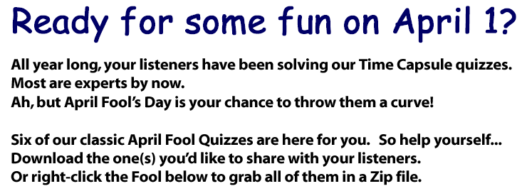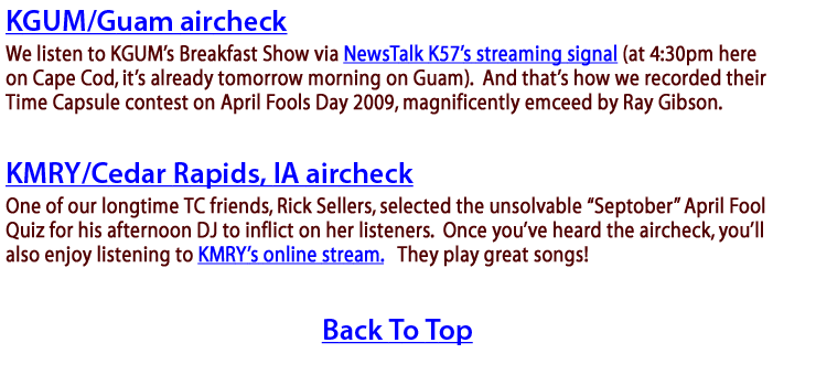 Right-click to save the December 19xx Quiz! Right-click to save the December 19xx Quiz! Right-click to save the December 19xx Answer! Right-click to save the September 1776 Quiz! Right-click to save the September 1776 Quiz! Right-click to save the September 1776 Answer Listen to K57's April Fool aircheck Listen to KMRY's April Fool aircheck Listen to K57 on Guam Listen to KMRY