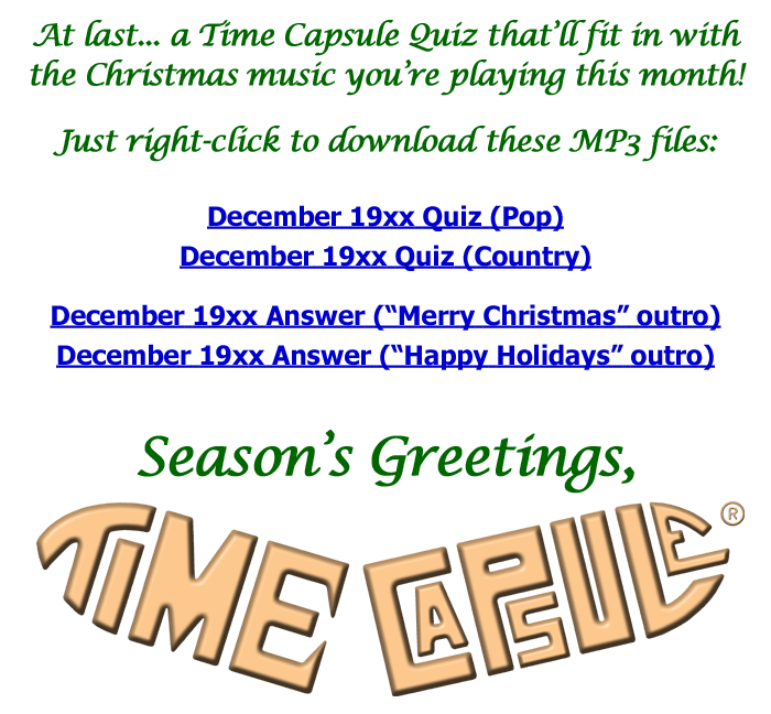 Quiz (w Pop theme bed)Quiz (w Country theme bed)Answer (w 'Merry Christmas' outro)Answer (w 'Happy Holidays' outro)What's the Time Capsule all about?  Click here...